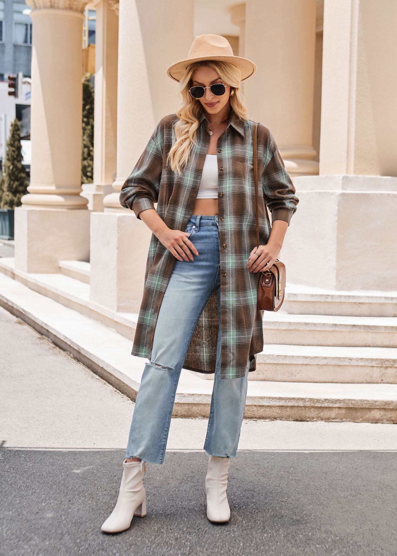 2023亚马逊女装秋冬新款 跨境欧美休闲时尚宽松长款风衣格子衬衫
